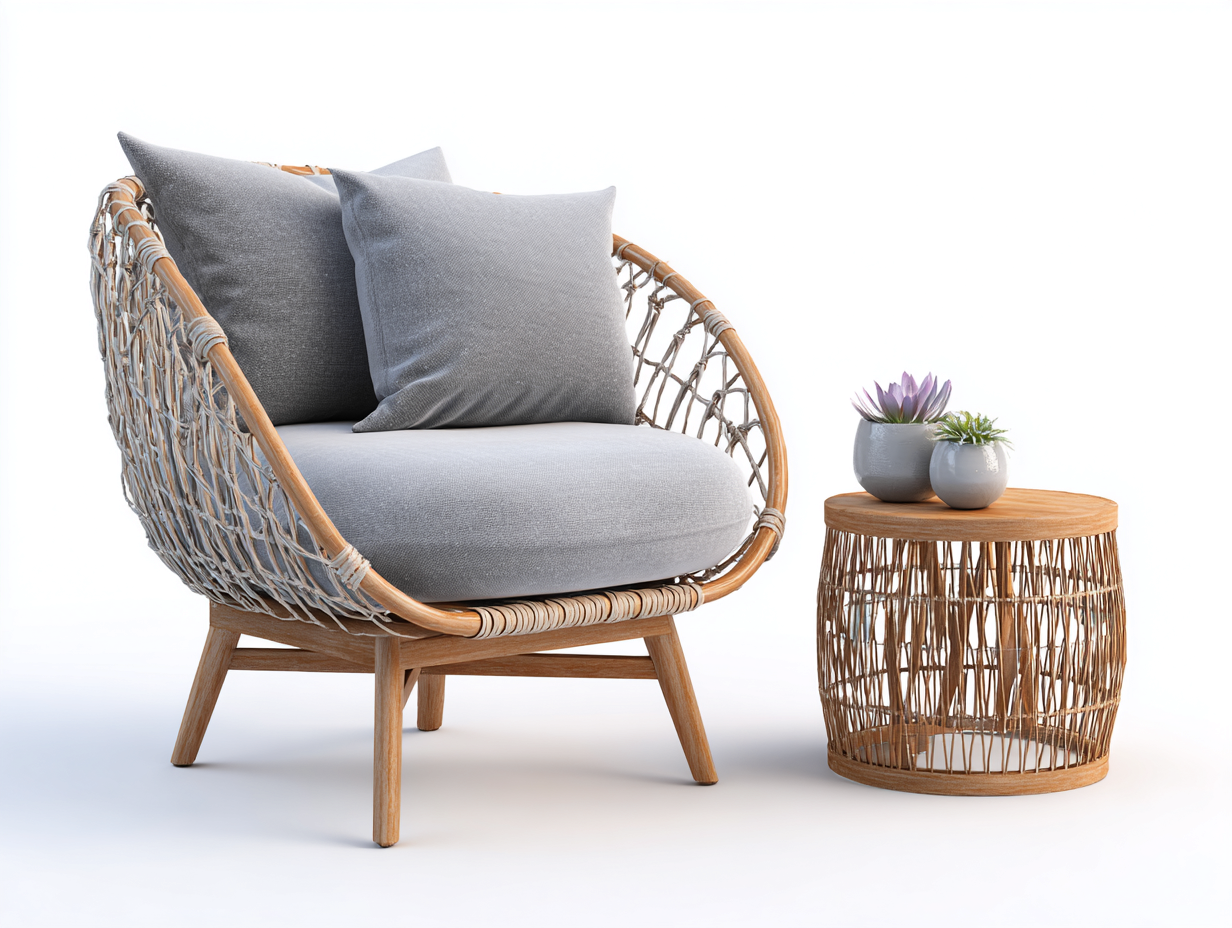 Set da giardino composto da una poltrona e un tavolino, progettato per arredare spazi esterni come giardini e terrazze. La struttura compatta e il design arrotondato offrono una soluzione funzionale per l'uso quotidiano all'aperto.